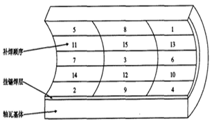 多層多道補(bǔ)焊。補(bǔ)焊順序見(jiàn)圖示。4)補(bǔ)焊軸瓦合金每一層每一道都要清理,用白布輕擦干凈。5)堆焊時(shí)一定要使弧坑填滿、緩慢收弧,以免產(chǎn)生氣孔及裂紋。6)補(bǔ)焊軸承合金要留夠加工余量,最后一層焊道要比軸瓦原始表面略高,并注意在焊道與原始表面交界處避免咬邊和未熔合等缺陷。