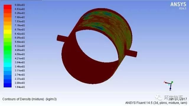 再后,設(shè)定進出口邊界條件,進口壓力這里設(shè)定的是2000Pa,出口壓力默認(rèn),設(shè)定主軸轉(zhuǎn)速3000r/min,轉(zhuǎn)速定義到油膜的壁面上,為方便收斂和計算,適當(dāng)修改松弛因子和收斂精度等參數(shù),給定一個空氣的初始體積分?jǐn)?shù)。
