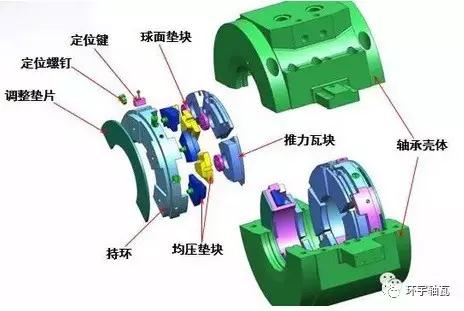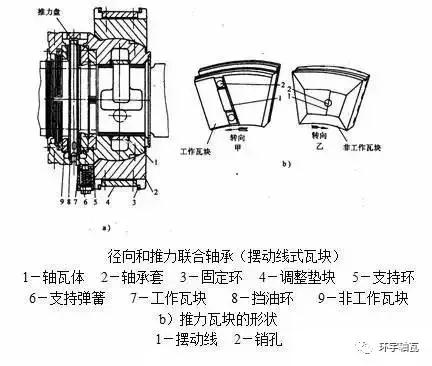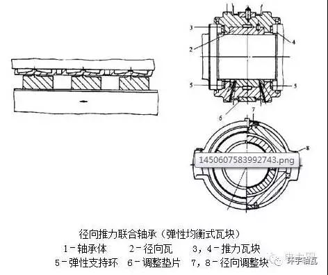還有一種為彈性均衡式瓦塊的徑向推力聯(lián)合軸承,推力瓦塊擱置在彈性圈上,承載時(shí)彈性圈產(chǎn)生彈性變形,以達(dá)到各塊瓦面與推力盤平面有良好接觸的要求。這種結(jié)構(gòu)運(yùn)用于剛性轉(zhuǎn)子并且軸向載荷不太大的機(jī)組。