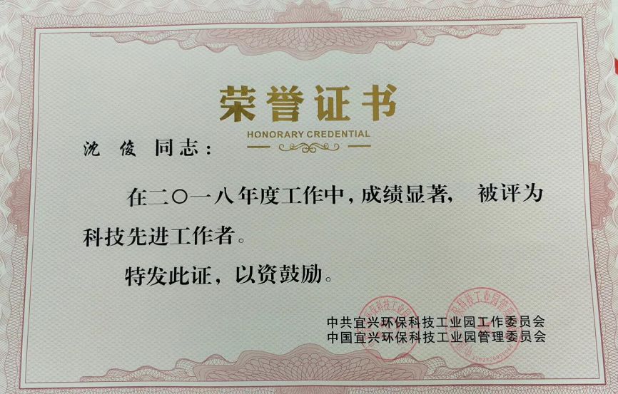 總經(jīng)理沈俊被中國宜興環(huán)??萍脊I(yè)園管理委員會評委“科技先進(jìn)工作者”