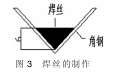 角鋼三角槽表面用刮刀銼刀及砂布進(jìn)行除銹清理渣滓工作,然后用丙酮溶液徹底清洗,避免污染焊絲然后將制作焊絲的巴氏合金材料用氧一乙炔加熱融化均勻地流入角鋼槽(見圖3)熔制形成焊絲后,將焊絲取出,用刮刀將表面氧化層去掉,同時倒去尖角,再用30%