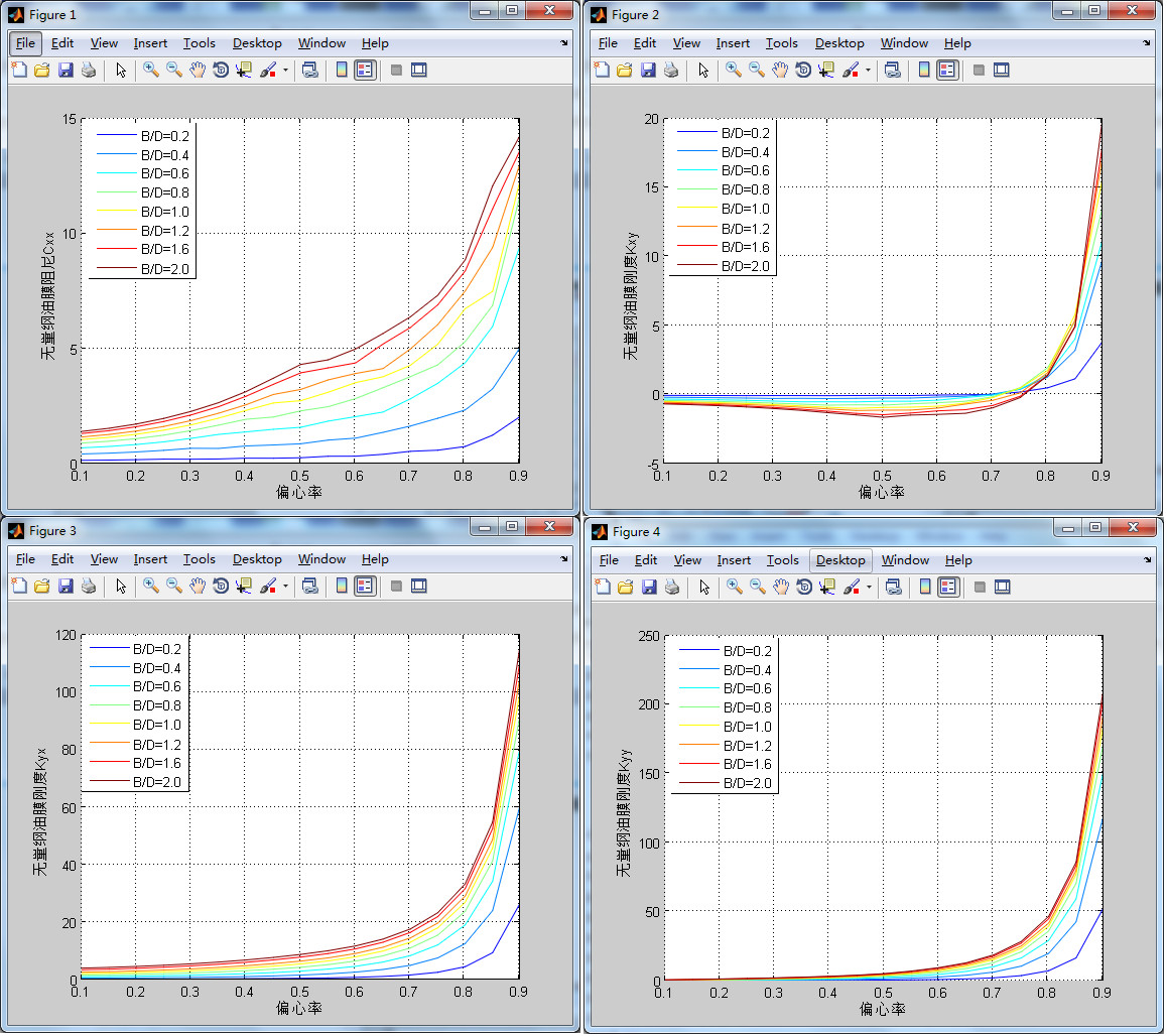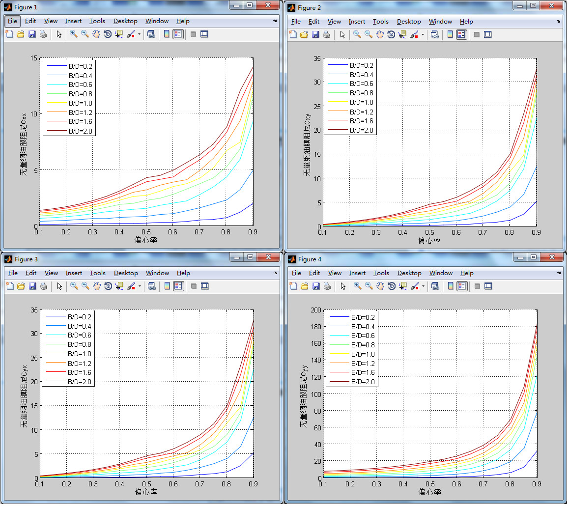 據(jù)上,用差分概念計算剛度、阻尼實質(zhì)上是求解八次雷諾方程,借助Matlab數(shù)值計算軟件進行編程可計算出無量綱剛度系數(shù)阻尼系數(shù)。