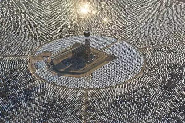 這張照片是位于美國加州莫哈維沙漠的伊萬帕太陽能發(fā)電站,計劃總發(fā)電量為392MW。和光伏電池發(fā)電不同,這是一個太陽能熱電站——173500個高效鏡子將陽光反射到140米的高塔頂端,產(chǎn)生的熱量驅(qū)動蒸汽輪機發(fā)電。某種意義上,這是阿基米德用鏡子燒毀戰(zhàn)船傳說的復(fù)興。不過路過的飛鳥就要倒霉了。