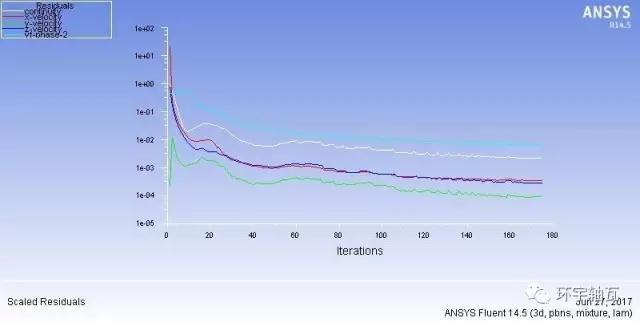 再后,設(shè)定進出口邊界條件,進口壓力這里設(shè)定的是2000Pa,出口壓力默認(rèn),設(shè)定主軸轉(zhuǎn)速3000r/min,轉(zhuǎn)速定義到油膜的壁面上,為方便收斂和計算,適當(dāng)修改松弛因子和收斂精度等參數(shù),給定一個空氣的初始體積分?jǐn)?shù)。
