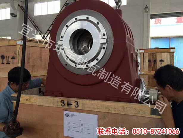 瓦塊上的銷釘孔設(shè)在違背基地7.54mm處,因而瓦塊的工作面和推力盤之間就構(gòu)成了楔形空隙。當(dāng)推力盤滾動時油在楔形空隙中遭到揉捏,壓力提高,因而這層油膜上具有接受轉(zhuǎn)子軸向推力的才能。裝置環(huán)安頓在球面座上,油通過節(jié)流孔送入推力軸承進(jìn)油室,分為兩路經(jīng)推力軸承球面座上的進(jìn)油孔進(jìn)入主軸周圍的環(huán)形油室,并在瓦塊之間徑向流過。在瓦塊與瓦塊之間留有寬敞的空間,便于油在瓦塊中循環(huán)。