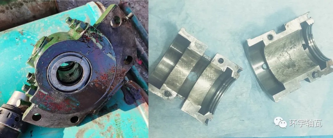 2. 下瓦合金大面積剝落和裂紋,且剝落表象不規(guī)則,此為疲勞剝落的典型形態(tài);(在交變載荷的作用下,軸承合金表面出現(xiàn)與滑動(dòng)方向垂直的疲勞裂紋,當(dāng)裂紋向軸承合金襯與襯背結(jié)合面擴(kuò)展后,造成軸承合金的剝落。)